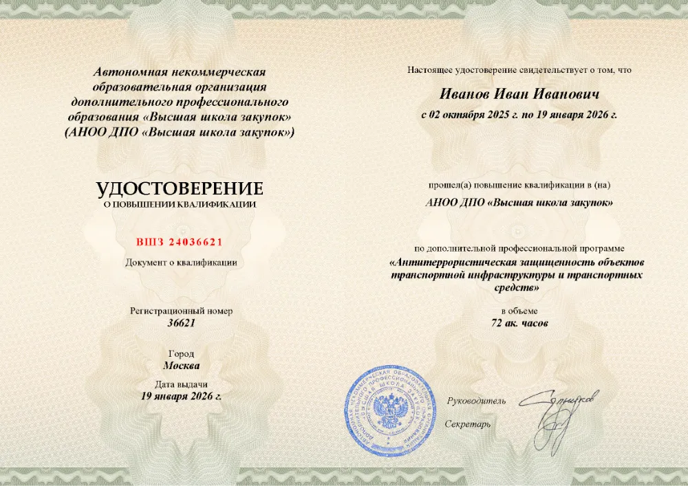 Повышение квалификации, 72 академических часов, 7 модулей: нормативно-правовые основы противодействия терроризму, анализ угроз и рисков, функциональные обязанности ответственных, инженерно-техническая укрепленность, документооборот и действия персонала при ЧС. Онлайн-обучение в в Тюмени с итоговой аттестацией.