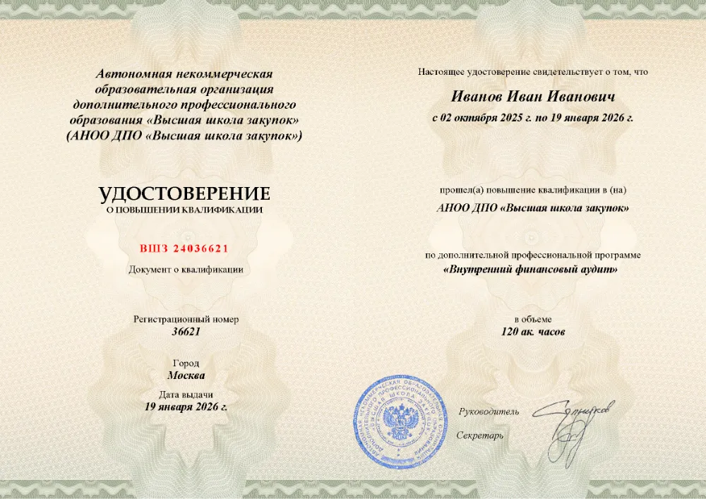 Повышение квалификации, 120 академических часов, 8 модулей: правовое регулирование и основы внутреннего финансового аудита, планирование и методика аудиторской проверки, выявление нецелевого использования средств и реализация результатов аудита. Онлайн-обучение в в Тюмени с итоговой аттестацией.