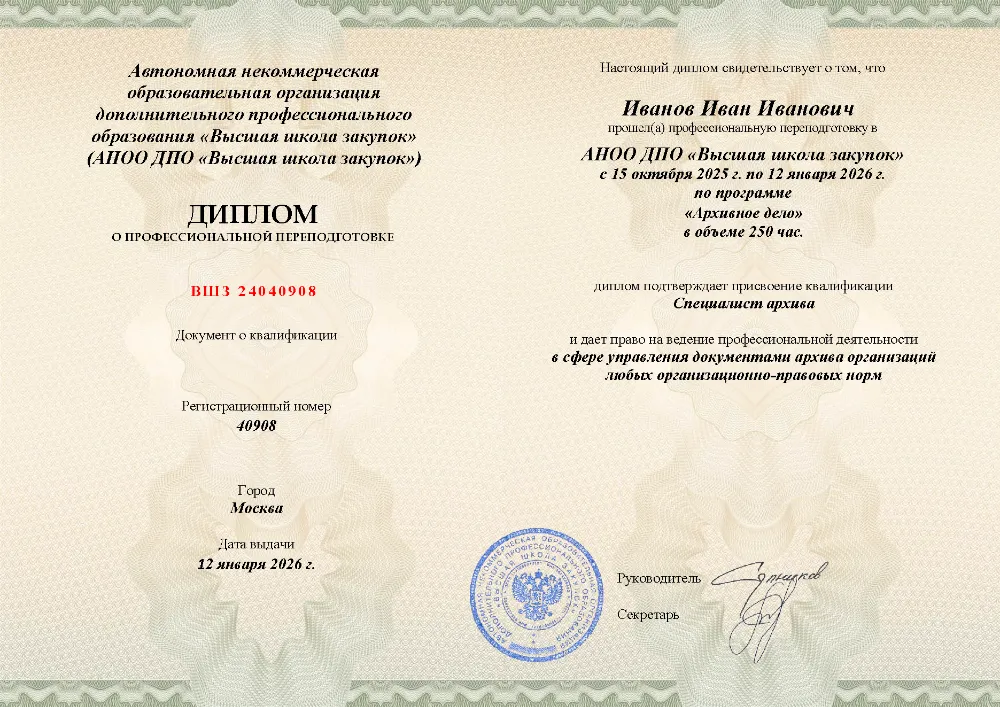 Программа профессиональной переподготовки (250 часов) для специалистов по архивному делу. Освойте правовые основы управления документами, технологии делопроизводства, оцифровку и организацию работы электронного архива с экспертизой ценности документов. Онлайн-обучение в в Тюмени с итоговой аттестацией.