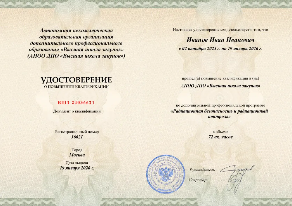 Повышение квалификации, 72 академических часа, 7 модулей: правовые и организационные основы деятельности, физические основы РБ и дозиметрия, учет РАВ и РАО, организация производственного контроля, обеспечение безопасности и физической защиты, документационное обеспечение и подготовка персонала. Онлайн-обучение в в Тюмени с итоговой аттестацией.