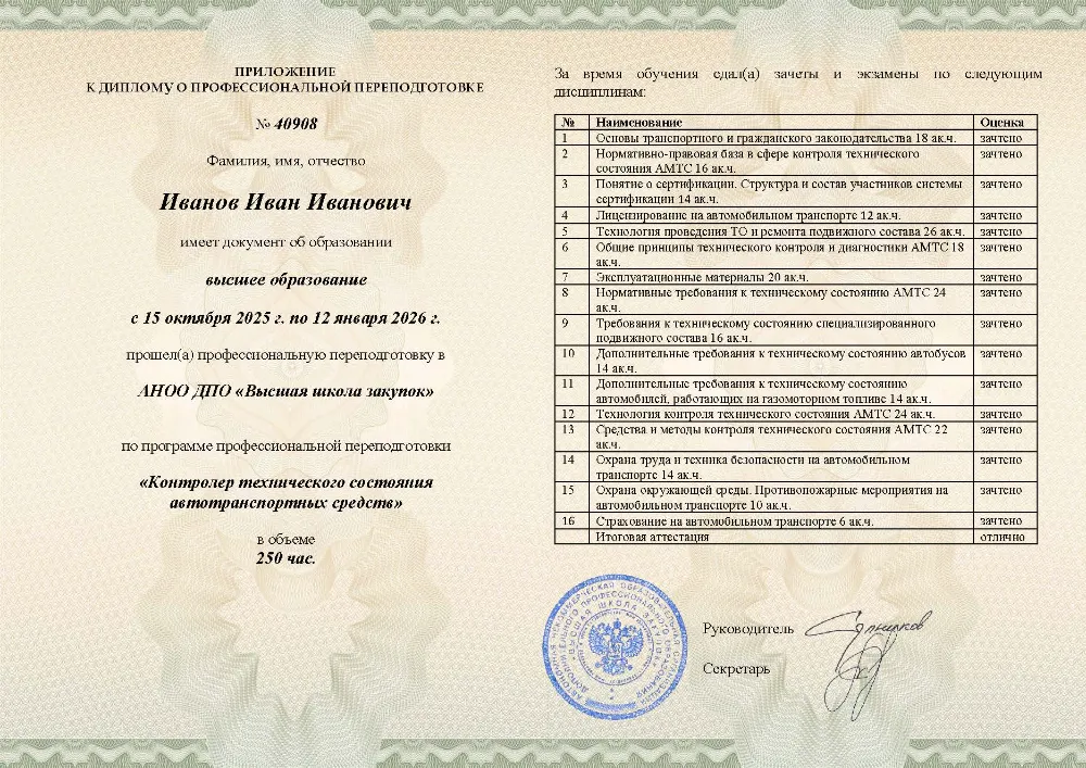 Повышение квалификации, 72 академических часа, 4 модуля: нормативные требования к техническому состоянию транспорта, технология и методы контроля, оценка состояния специализированного подвижного состава и автобусов, охрана труда и техника безопасности. Онлайн-обучение в в Тюмени с итоговой аттестацией.