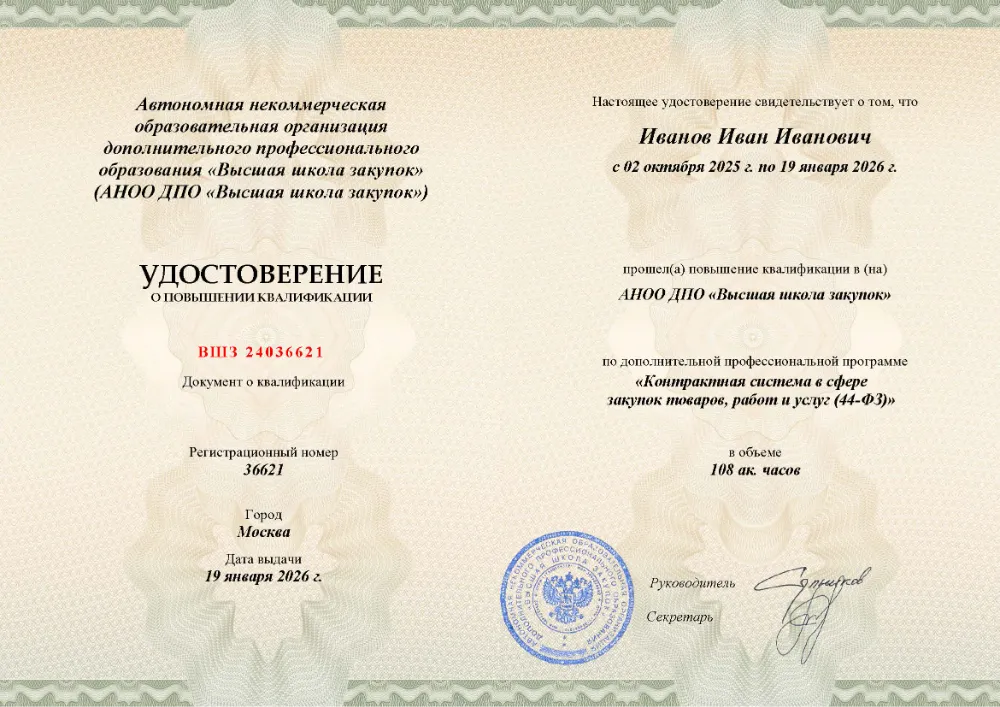Повышение квалификации, 108 академических часов, 4 модуля: общие положения, принципы и планирование закупок по 44-ФЗ, процедура закупки у единственного поставщика, заключение, исполнение, расторжение и банковское сопровождение государственного контракта. Онлайн-обучение в в Тюмени с итоговой аттестацией.